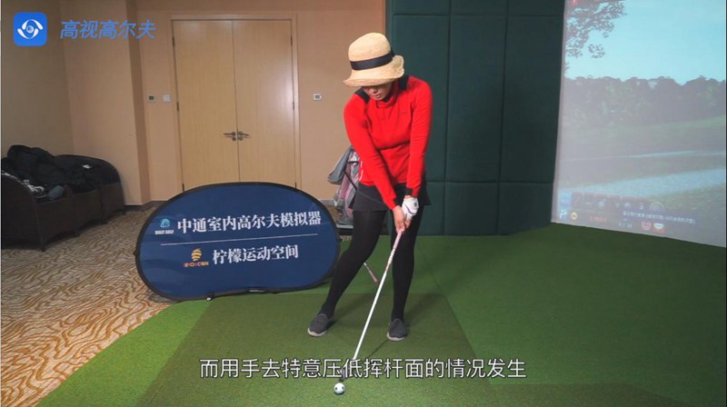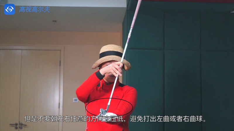 切忌在整個(gè)揮桿過(guò)程中為了保持稍微低點(diǎn)的角度而用手去特意壓低揮桿面,以下為錯(cuò)誤示例: