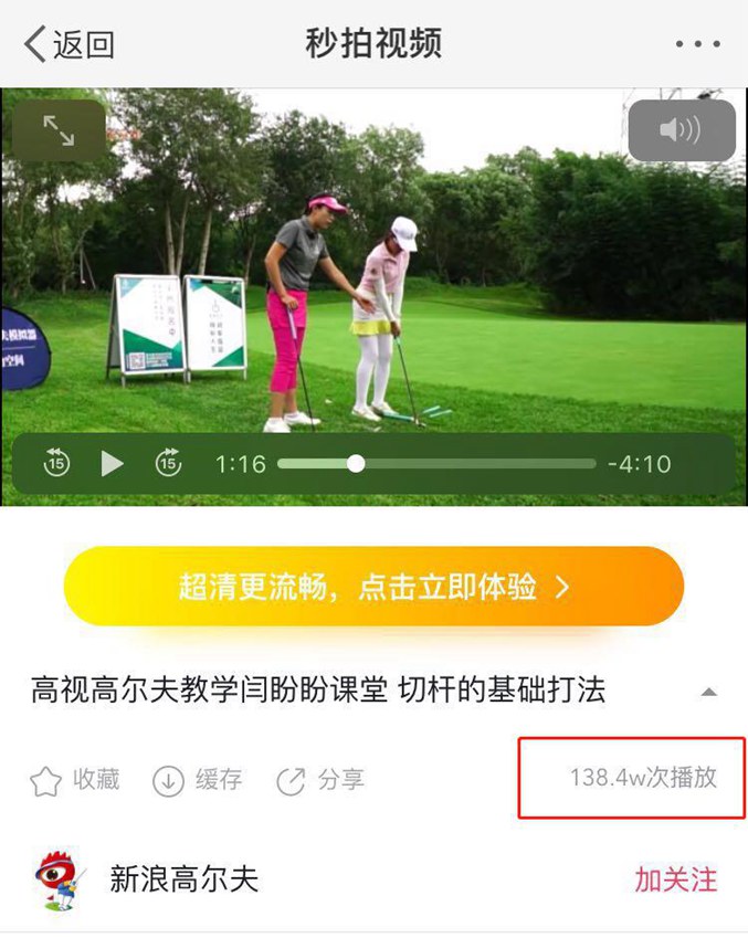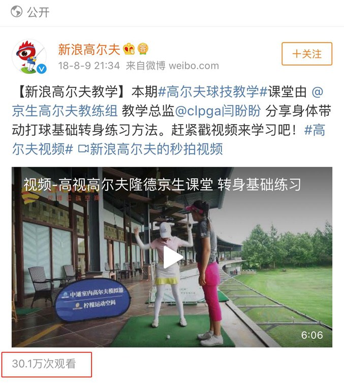 同時,閆教練持續(xù)和高視高爾夫媒體平臺合作錄制教學視頻,內(nèi)容涉及高爾夫基礎轉(zhuǎn)身,站姿,揮桿,切桿等干貨技巧,教學視頻投放到高視高爾夫所有媒體平臺及新浪微博和新浪體育頻道,在秒拍和新浪高爾夫微博觀看量達30萬次。